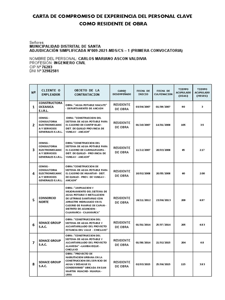 CARTA DE COMPROMISO DE EXPERIENCIA DEL PERSONAL CLAVE