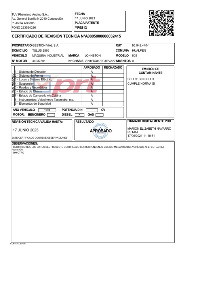 CERTIFICADO DE REVISIÓN TÉCNICA N°A0805000000032415