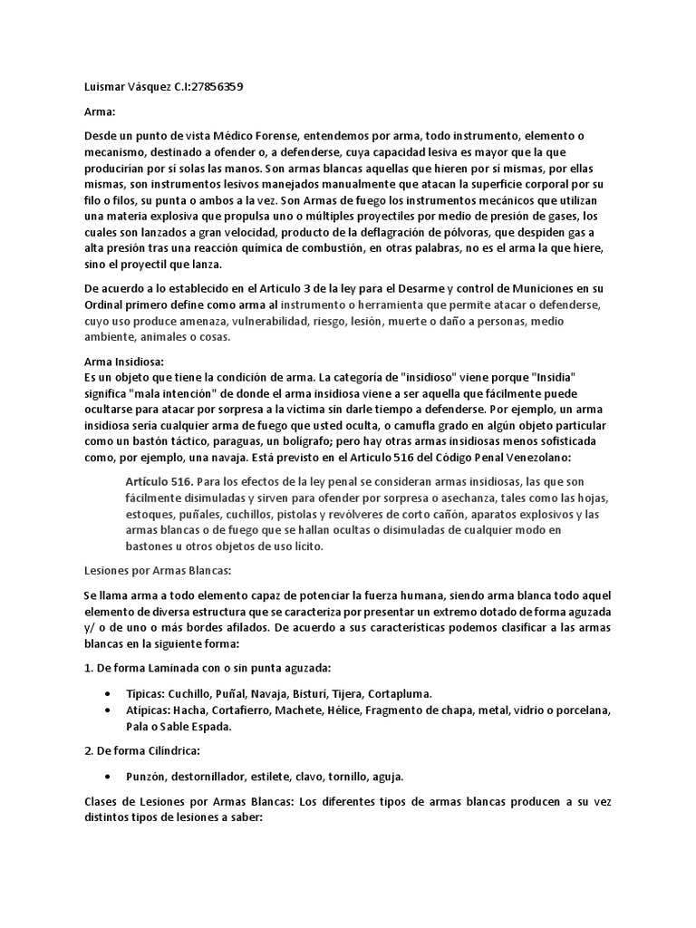 Desde un punto de vista Médico Forense, entendemos por arma, todo instrumento, elemento o