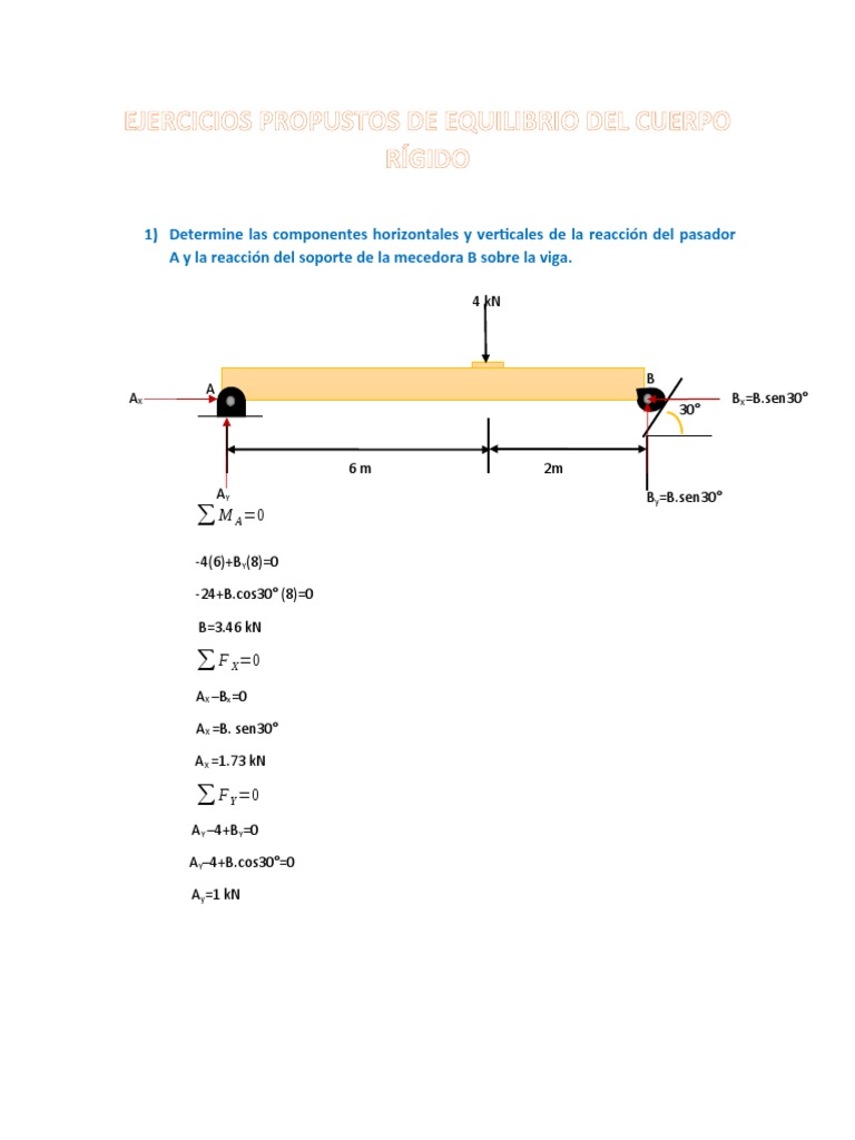 1) Determine las componentes horizontales y verticales de la reacción del pasador