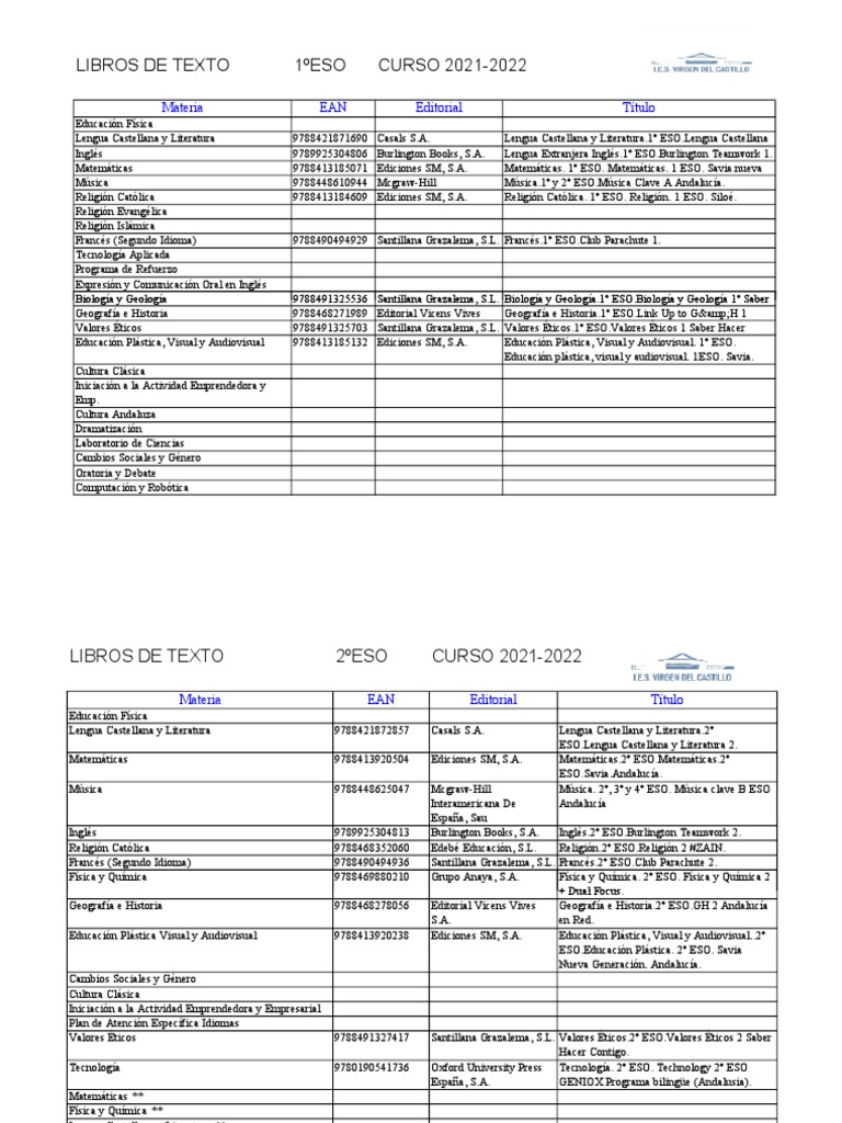 LIBROS DE TEXTO 2ºESO CURSO 2021-2022