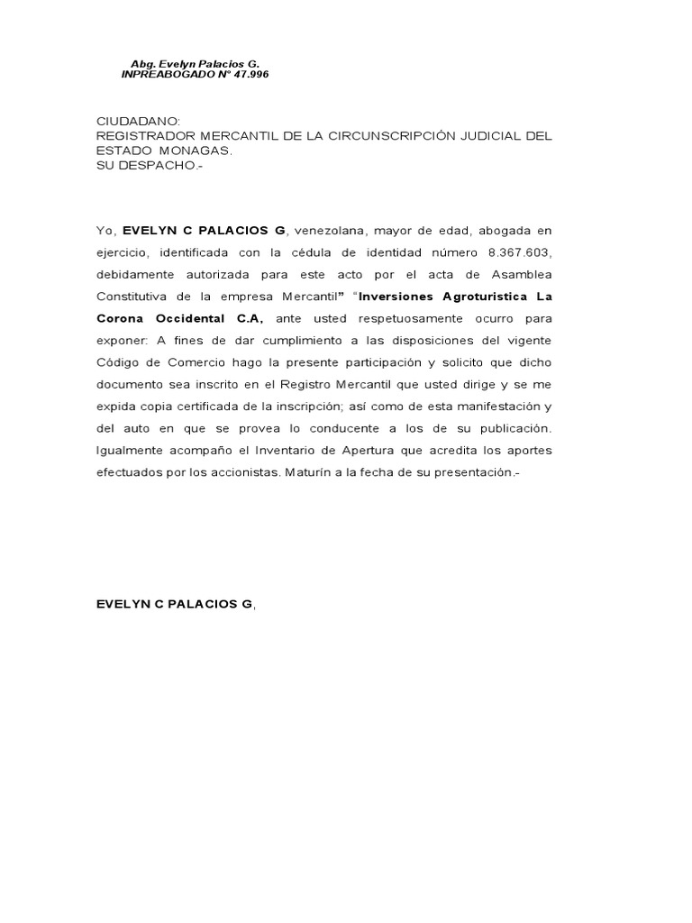 Constitutiva de la empresa Mercantil” “Inversiones Agroturistica La