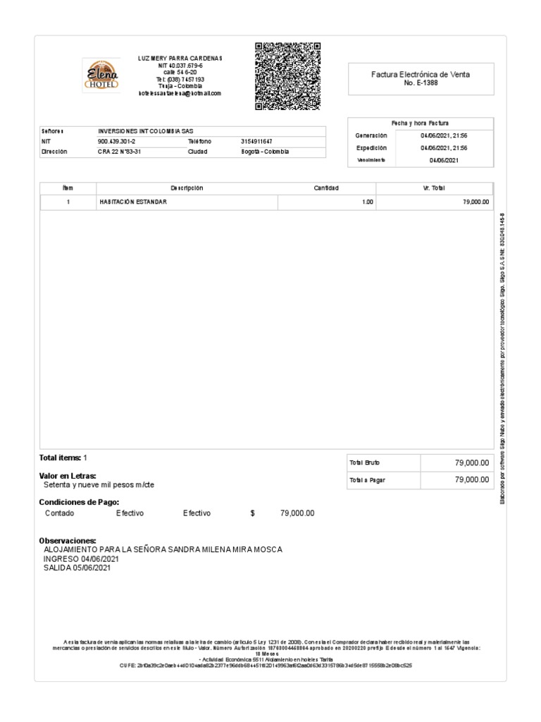 ALOJAMIENTO PARA LA SEÑORA SANDRA MILENA MIRA MOSCA