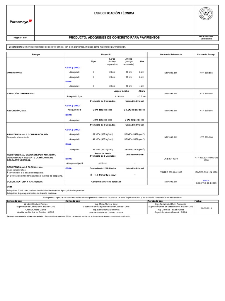 Página 1 de 1 PRODUCTO: ADOQUINES DE CONCRETO PARA PAVIMENTOS Versión 02