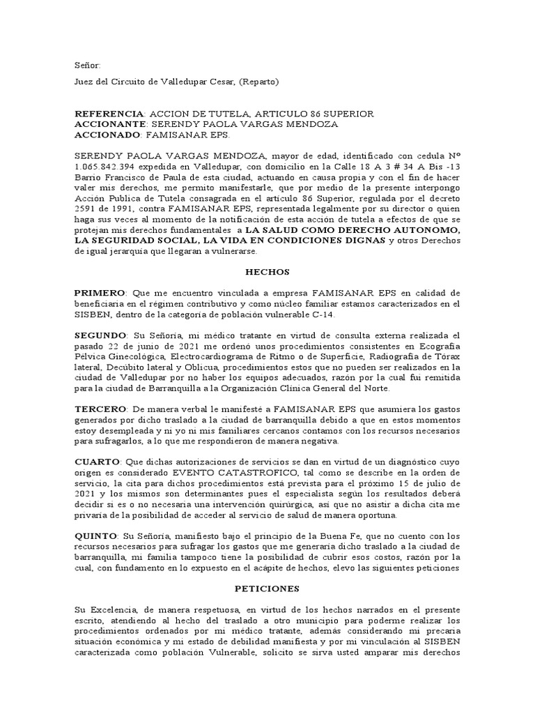 ACCIONANTE: SERENDY PAOLA VARGAS MENDOZA