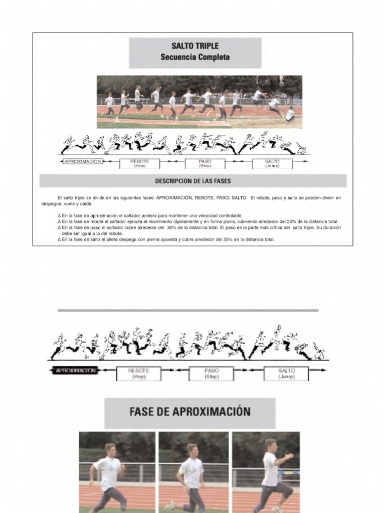 El salto triple se divide en las siguientes fases: APROXIMACIÓN, REBOTE, PASO, SALTO. El rebote, paso y salto se pueden dividir en
