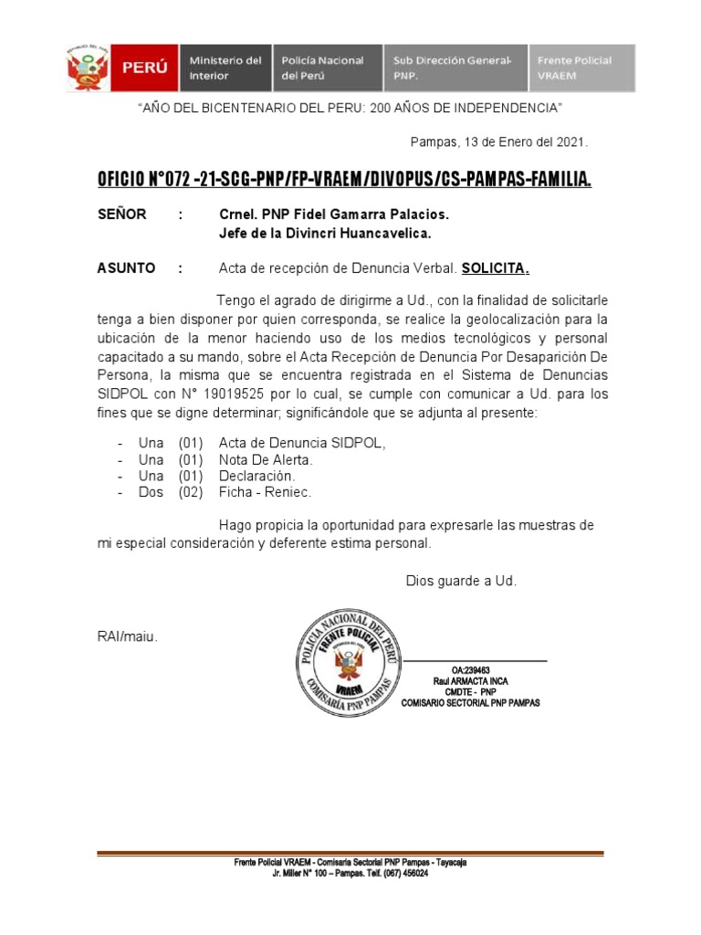 OFICIO N°072 -21-SCG-PNP/FP-VRAEM/DIVOPUS/CS-PAMPAS-FAMILIA.