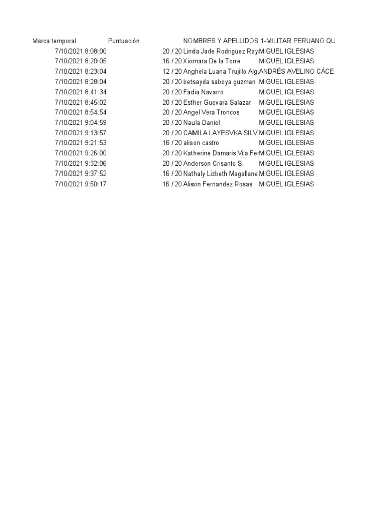Marca temporal Puntuación NOMBRES Y APELLIDOS 1-MILITAR PERUANO QU