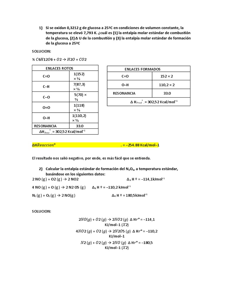 de la glucosa, (2) Δ U de la combustión y (3) la entalpía molar estándar de formación