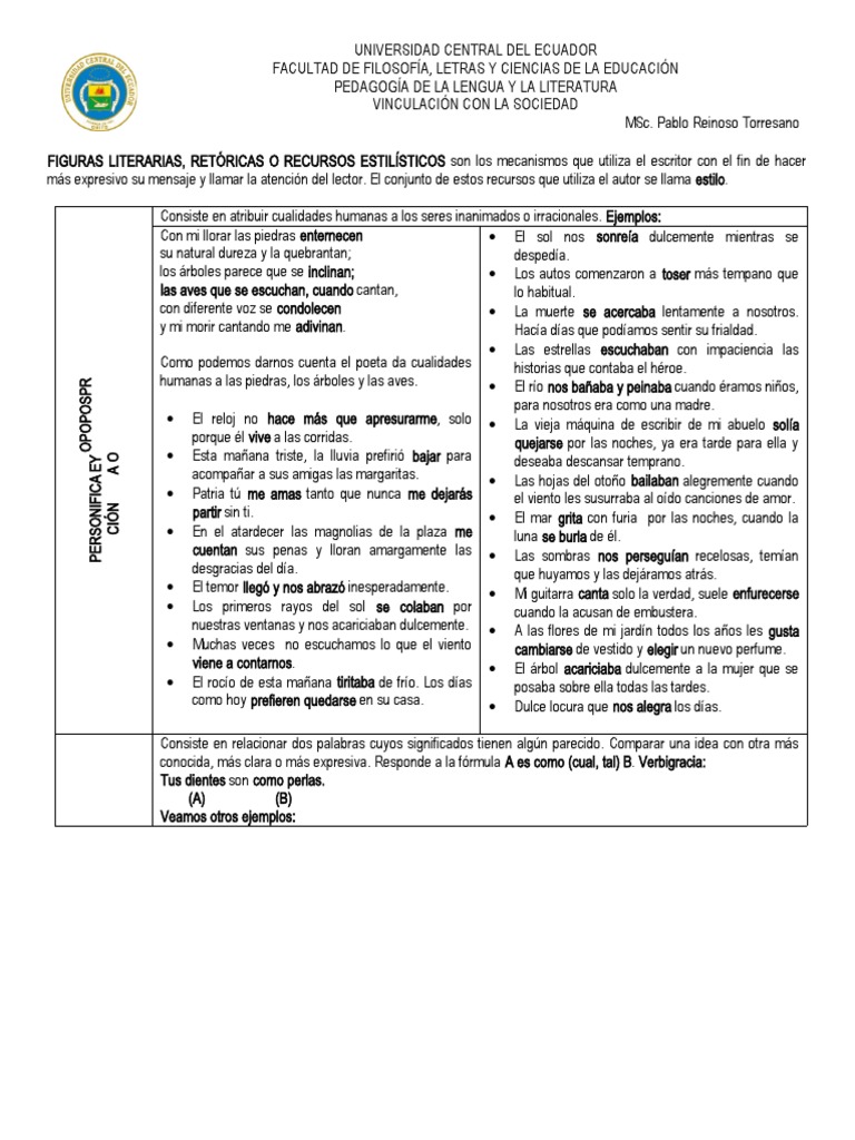 Consiste en atribuir cualidades humanas a los seres inanimados o irracionales. Ejemplos: