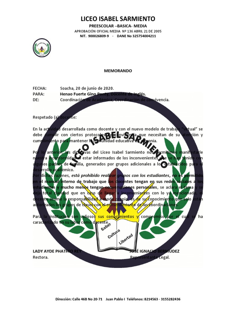 Por lo anterior, las directivas del Liceo Isabel Sarmiento nos permitimos manifestarle