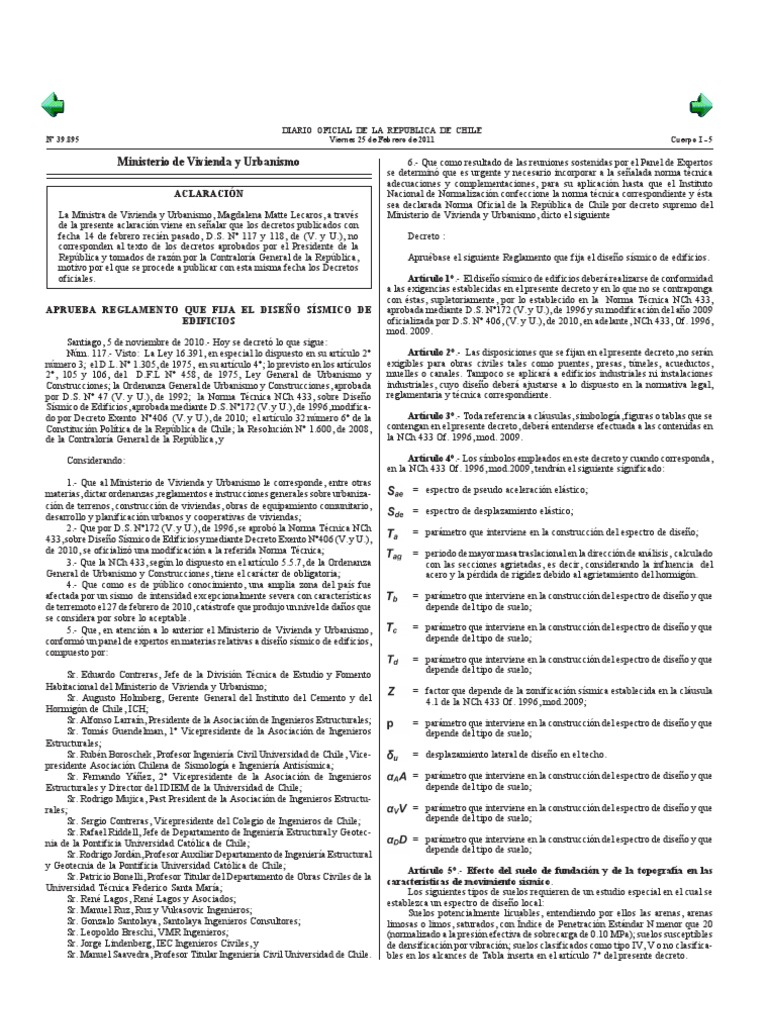 APRUEBA REGLAMENTO QUE FIJA EL DISEÑO SÍSMICO DE aprobada mediante D.S. Nº172 (V. y U.), de 1996 y su modificación del año 2009