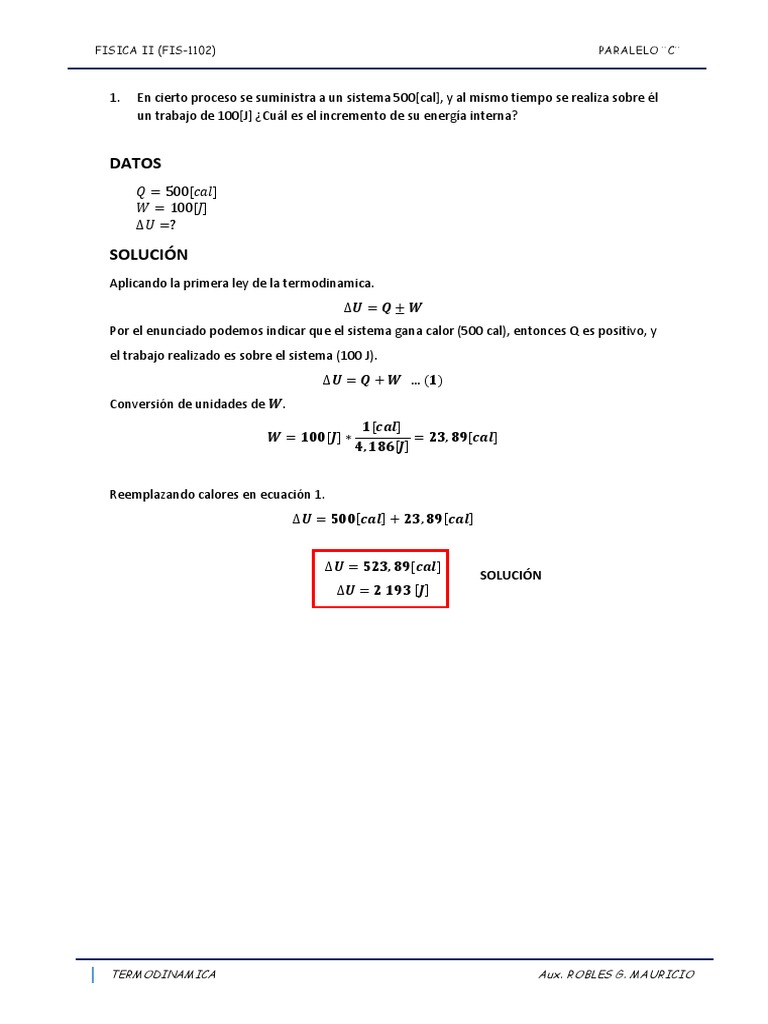 1. En cierto proceso se suministra a un sistema 500[cal], y al mismo tiempo se realiza sobre él