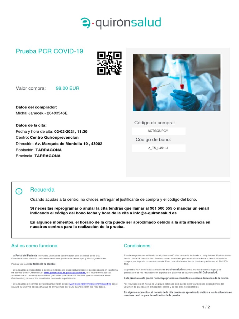 - Si la realizas en hospitales o centros médicos de Quironsalud desde el acceso rápido en la página La prueba PCR contratada a través de e-quironsalud incluye la muestra nasofaríngea y la