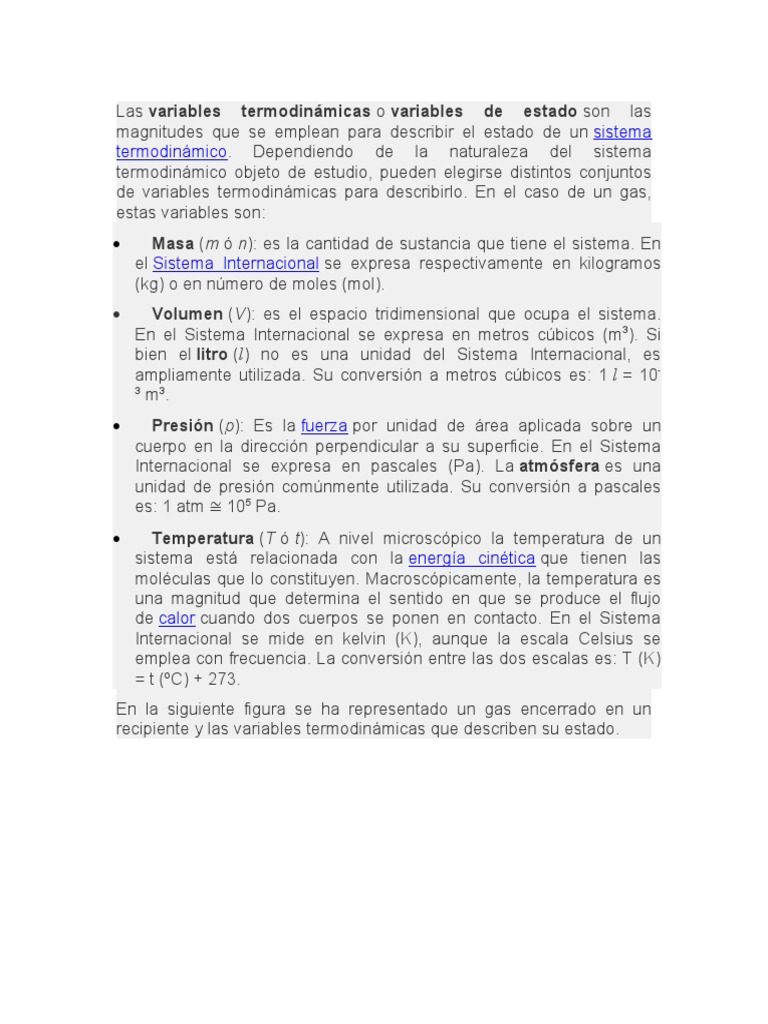 recipiente y las variables termodinámicas que describen su estado.
