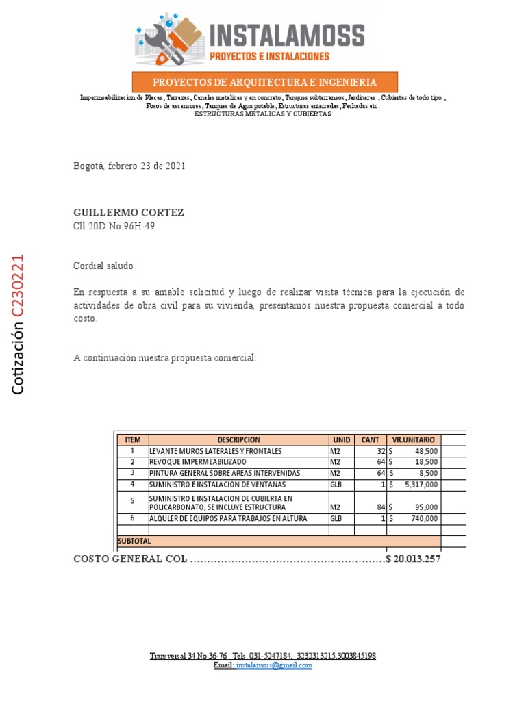 actividades de obra civil para su vivienda, presentamos nuestra propuesta comercial a todo