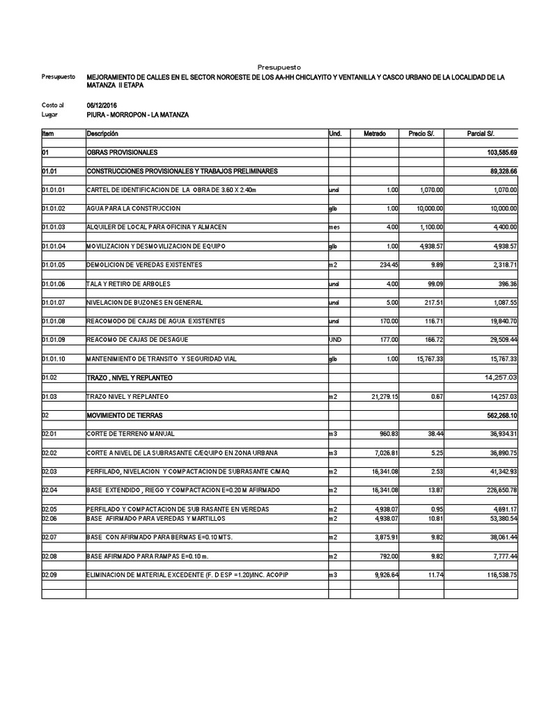 Presupuesto MEJORAMIENTO DE CALLES EN EL SECTOR NOROESTE DE LOS AA-HH CHICLAYITO Y VENTANILLA Y CASCO URBANO DE LA LOCALIDAD DE LA