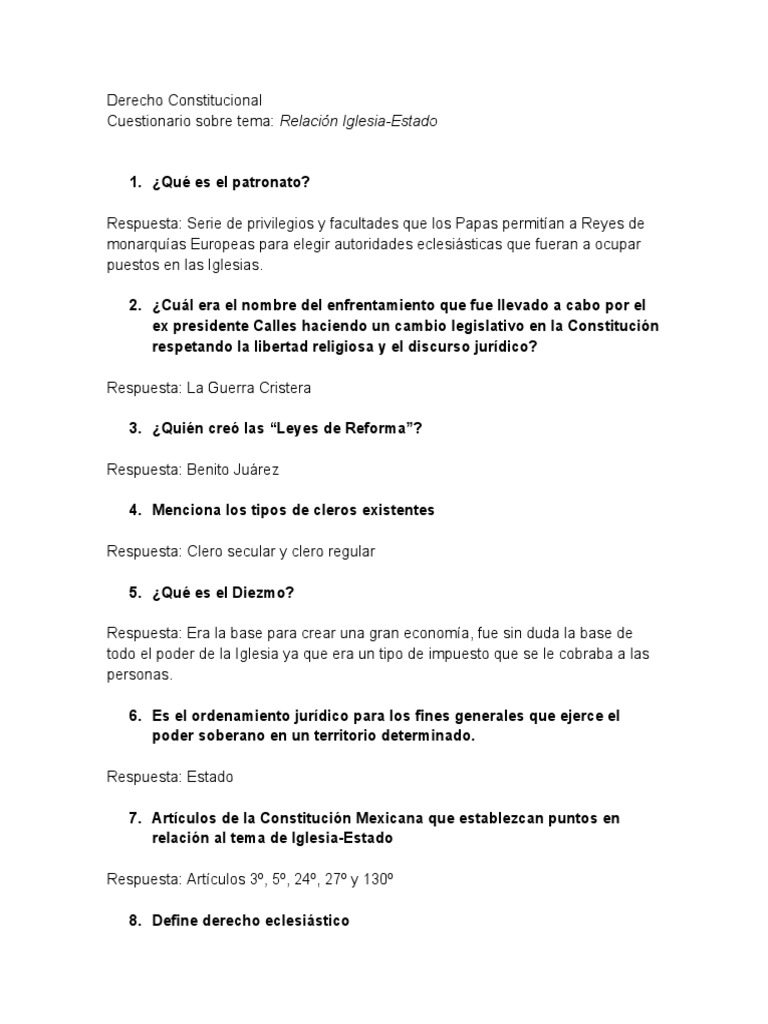 Cuestionario sobre tema: Relación Iglesia-Estado
