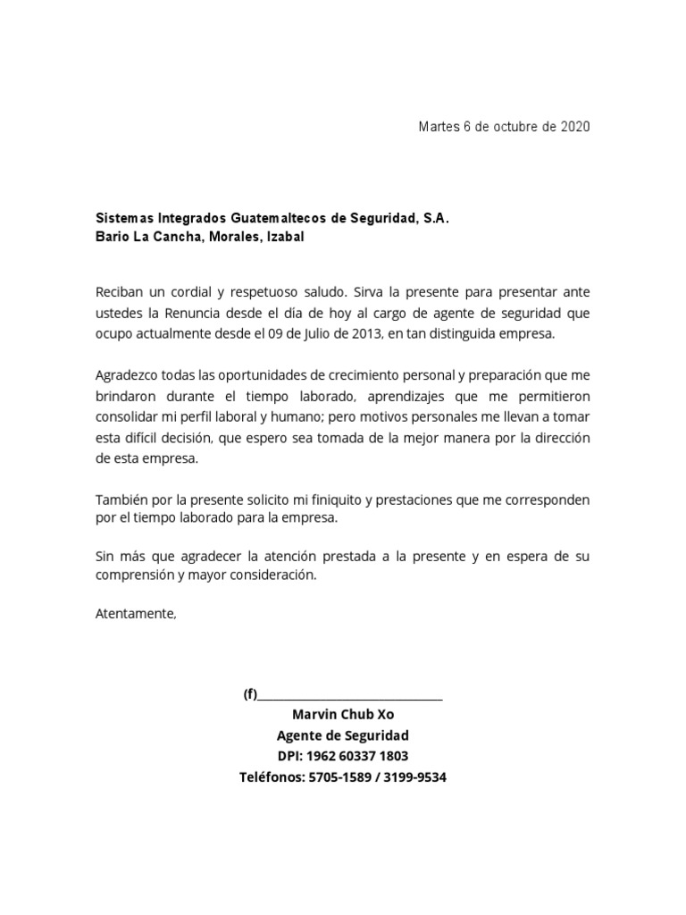 ustedes la Renuncia desde el día de hoy al cargo de agente de seguridad que