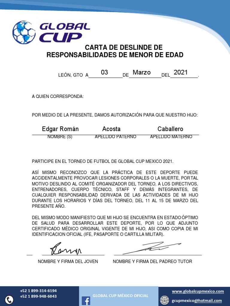 POR MEDIO DE LA PRESENTE, DAMOS AUTORIZACIÓN PARA QUE NUESTRO HIJO: