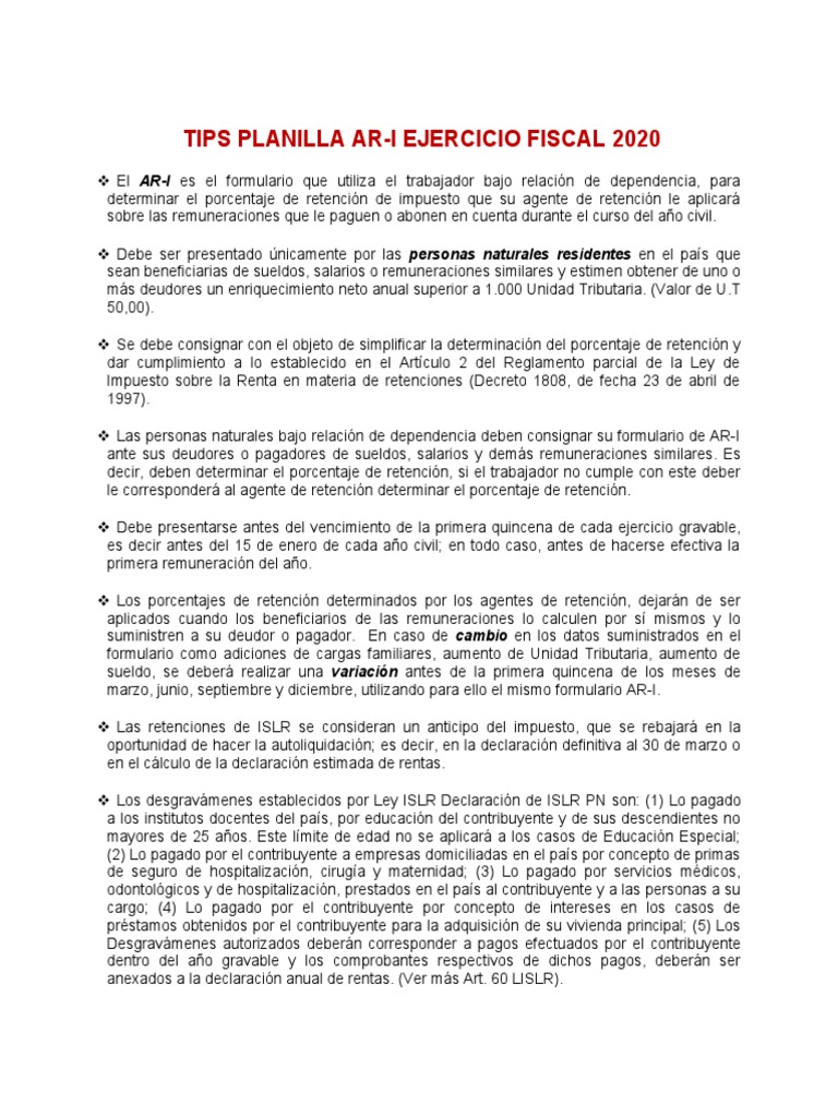 TIPS PLANILLA AR-I EJERCICIO FISCAL 2020