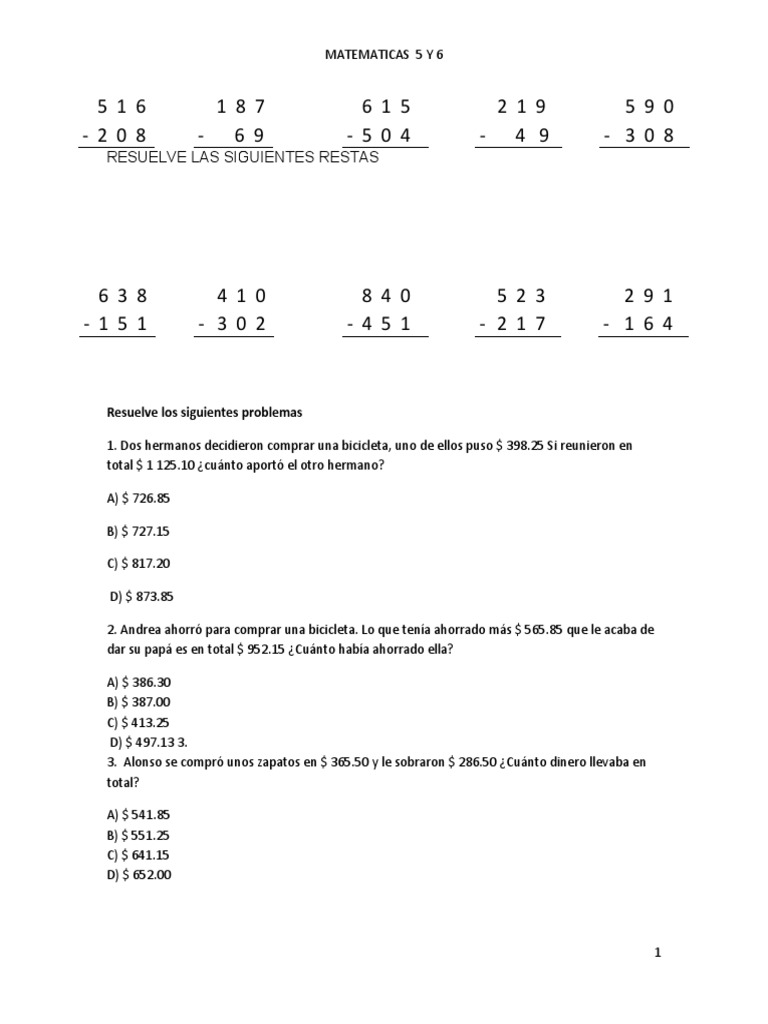 Resuelve las siguientes restas