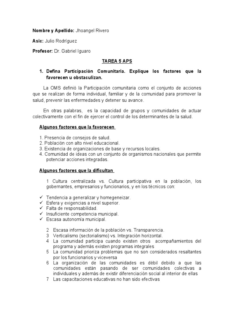 1. Defina Participación Comunitaria. Explique los factores que la