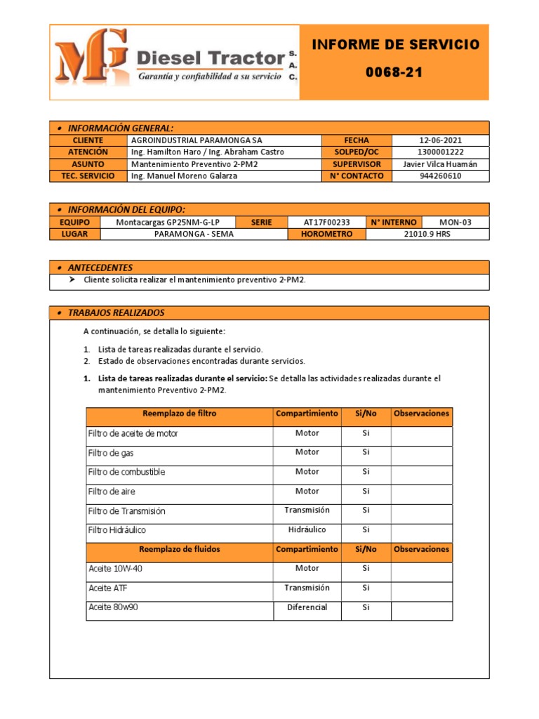 Se concluye el servicio de mantenimiento preventivo 2-PM2 de forma satisfactoria dejando el equipo