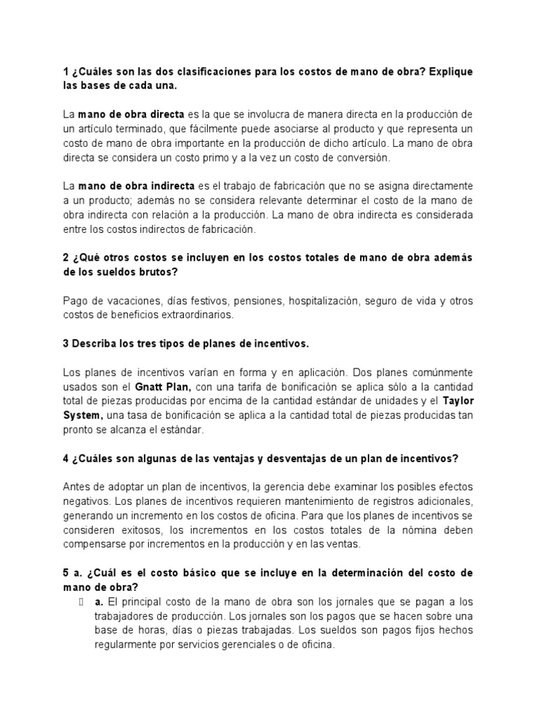 1 ¿Cuáles son las dos clasificaciones para los costos de mano de obra?