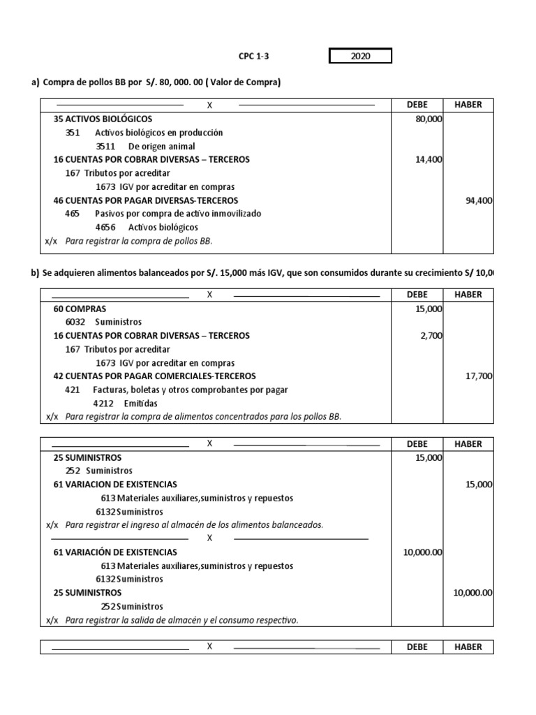 b) Se adquieren alimentos balanceados por S/. 15,000 más IGV, que son consumidos durante su crecimiento S/ 10,000