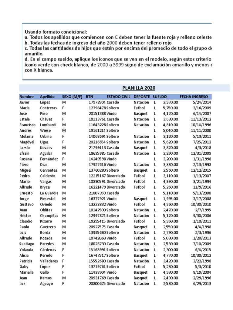 Nombre Apellido SEXO (M/F) RTN ESTADO CIVIL DEPORTE SUELDO FECHA INGRESO