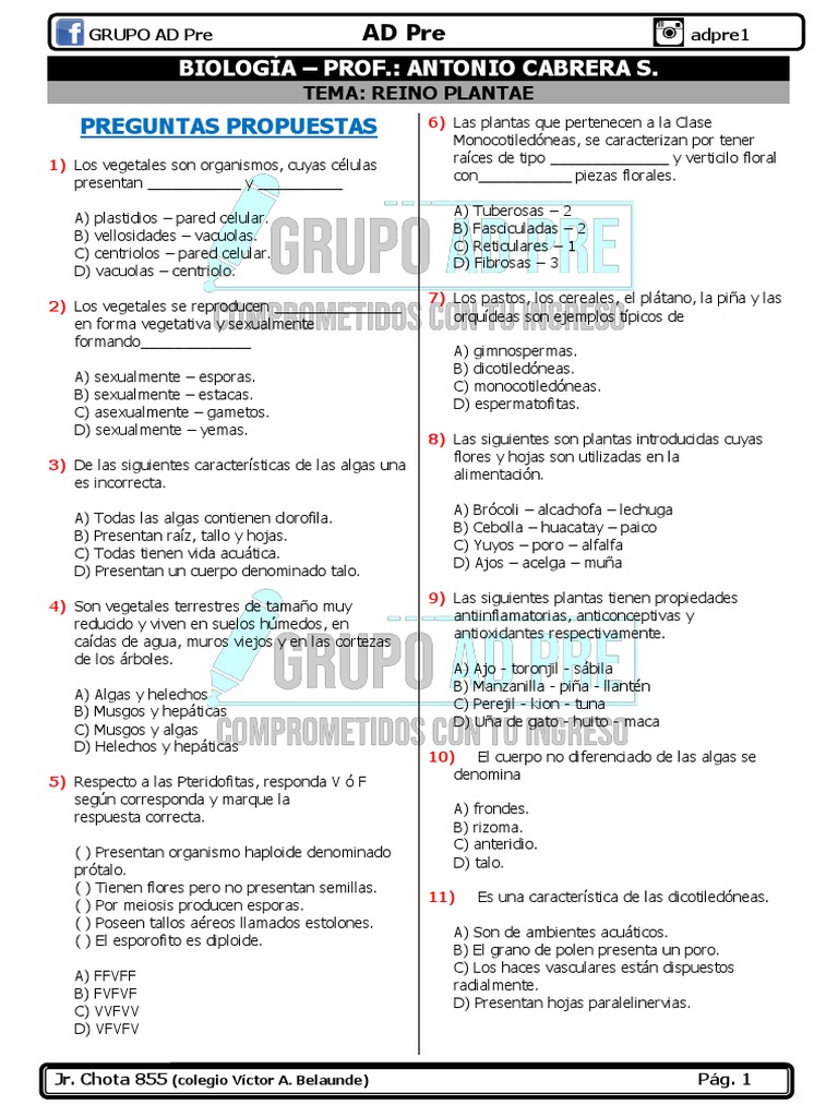PREGUNTAS PROPUESTAS 6) Las plantas que pertenecen a la Clase