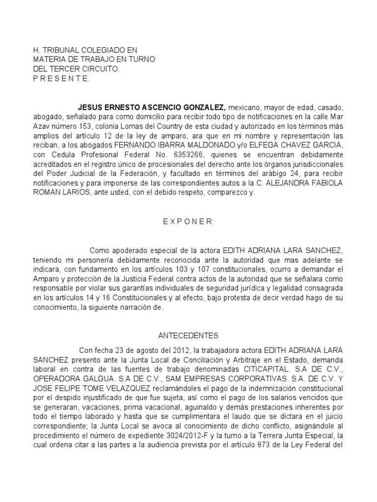 Como apoderado especial de la actora EDITH ADRIANA LARA SANCHEZ,