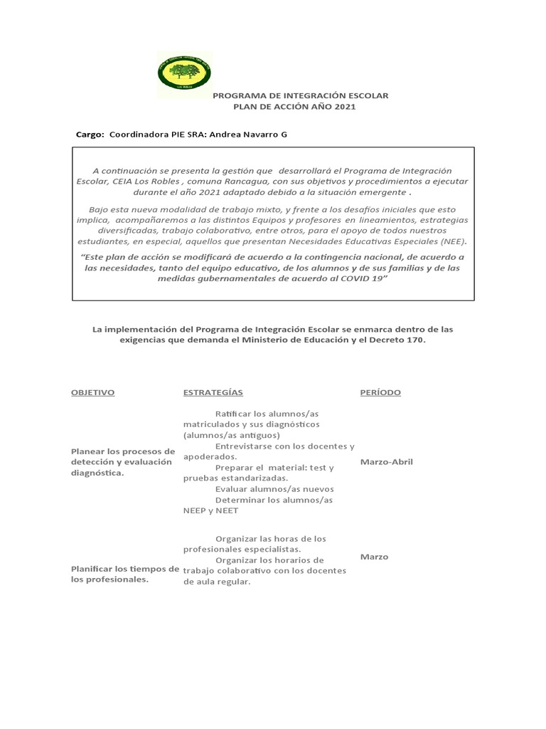 Escolar, CEIA Los Robles , comuna Rancagua, con sus objetivos y procedimientos a ejecutar