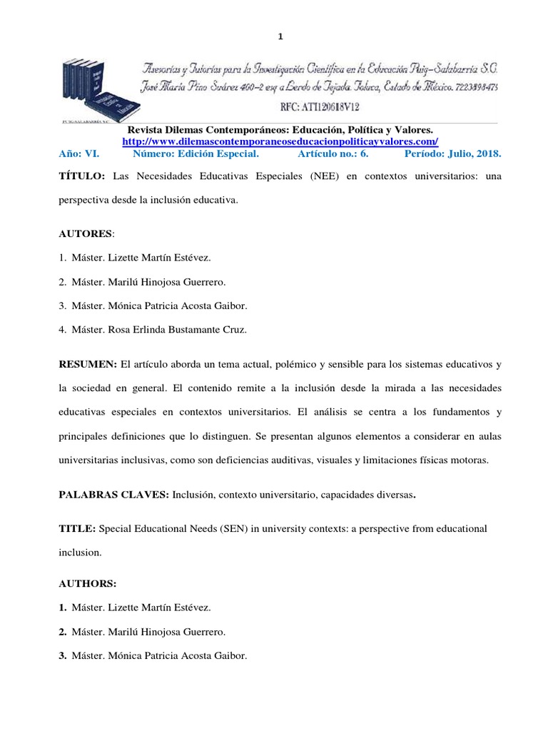 1. Borges R. S. (2014). Inclusión educativa y Educación Especial. Un horizonte singular y diverso