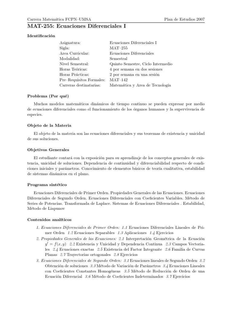 El objeto de la materia son las ecuaciones diferenciales y sus teoremas de existencia y unicidad