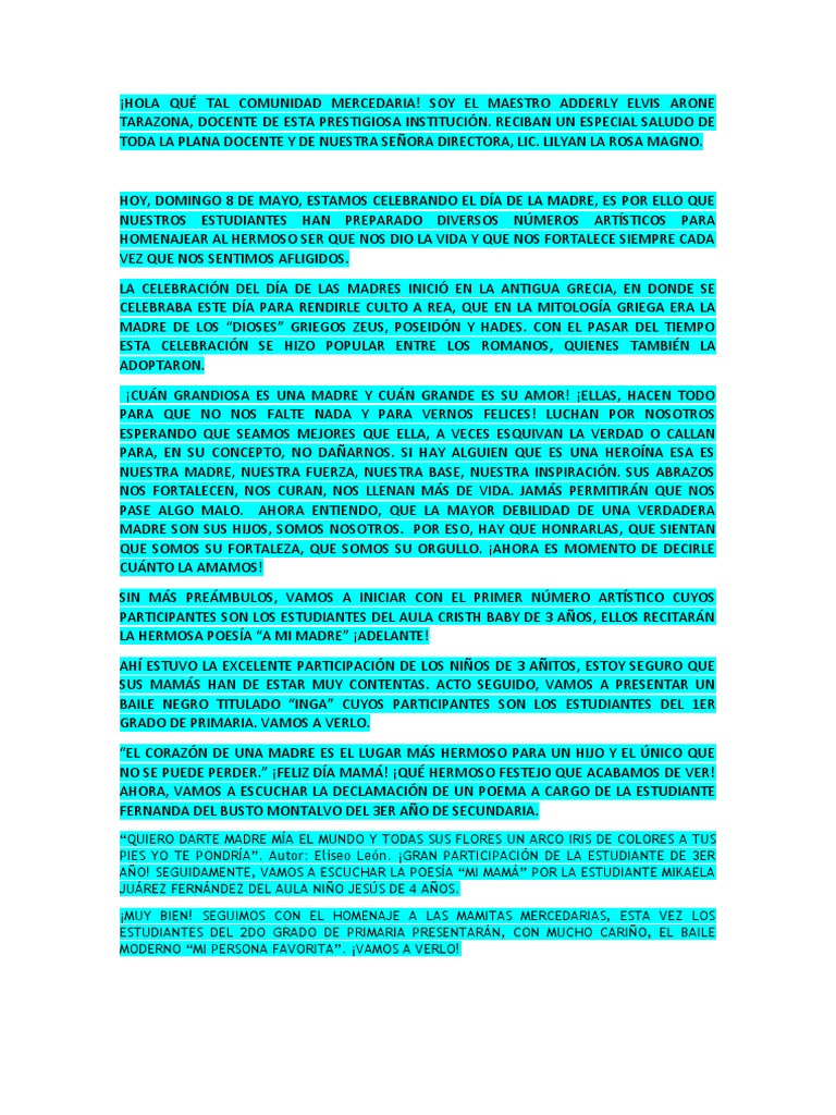 SALUDO Y PRESENTACIÓN POR EL DÍA DE LA MADRE A CARGO DE LA ESTUDIANTE LUANA