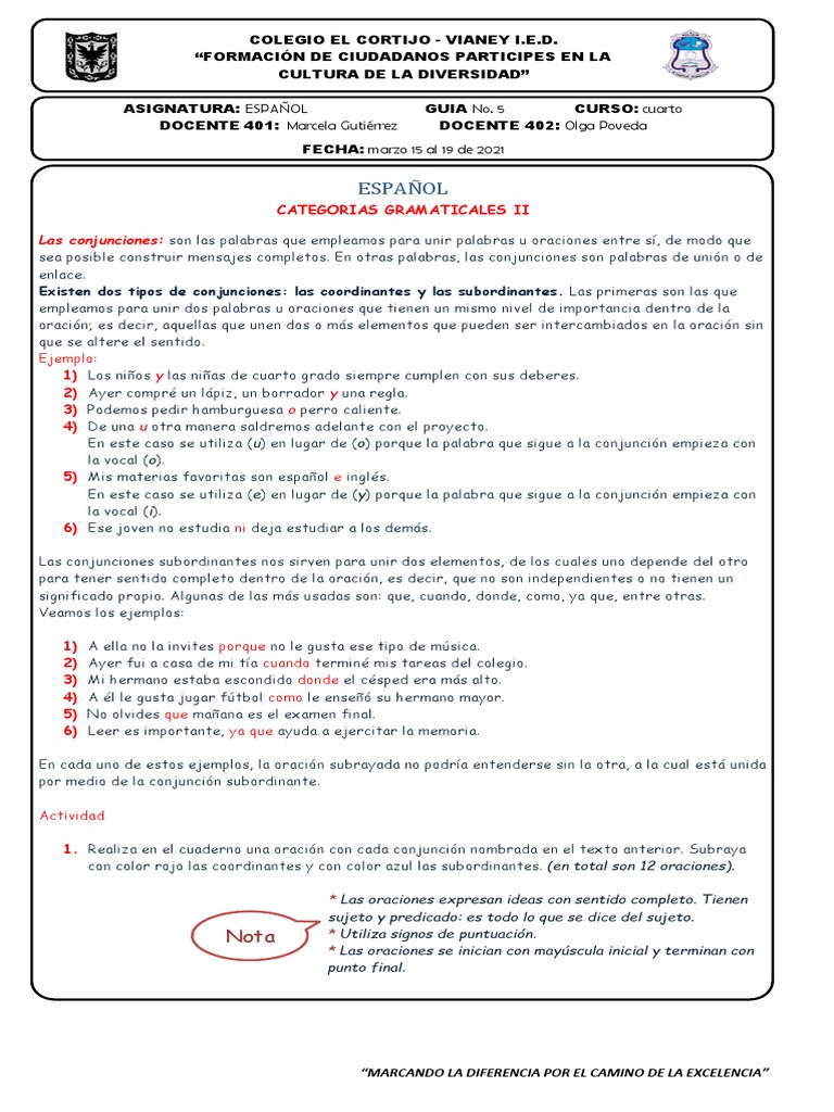 1. Realiza en el cuaderno una oración con cada conjunción nombrada en el texto anterior. Subraya