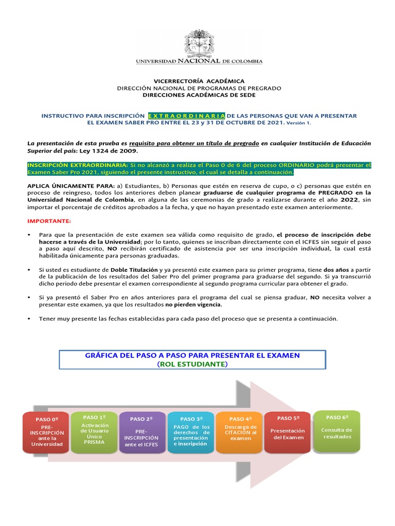http://www.pregrado.unal.edu.co/saberpro/ para realizar la preinscripción ante la Universidad.
