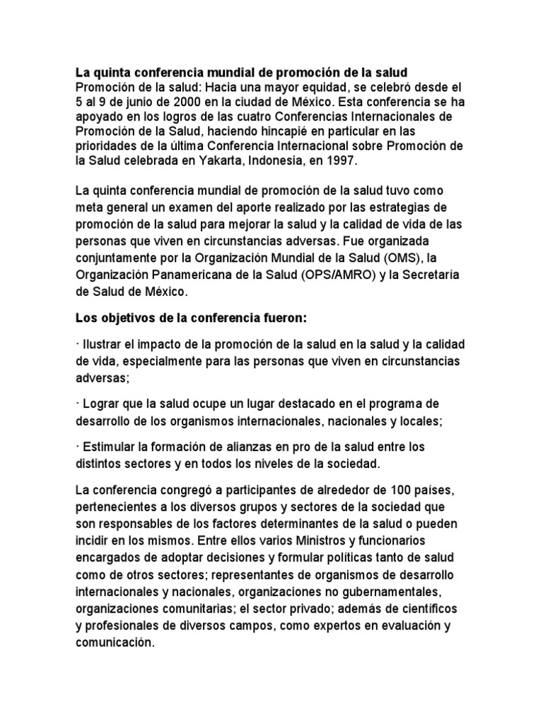 La quinta conferencia mundial de promoción de la salud tuvo como