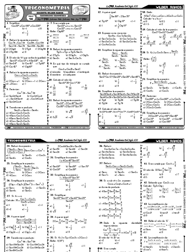 29. Transformar a producto: La 35. Si: f x Tg x Cos 3x 2Cos x El valor de " A B " es: La 45. La simplificación de: