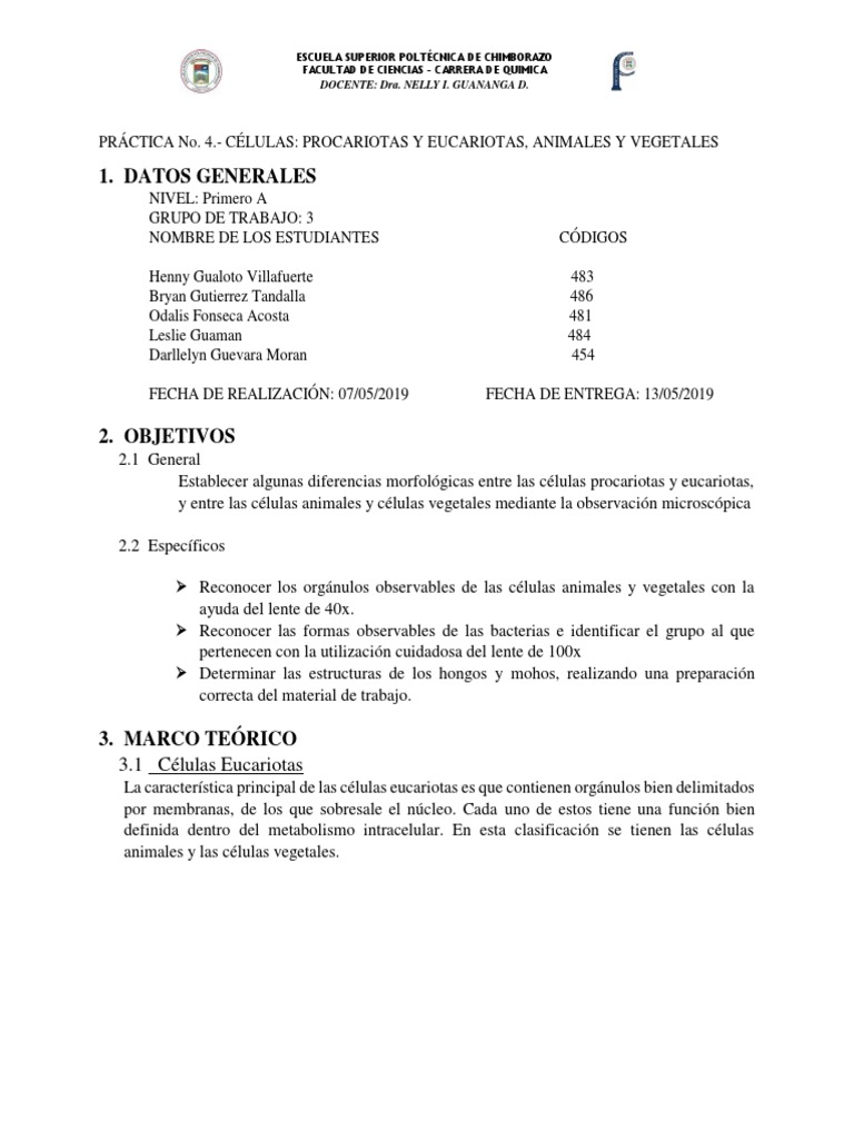 PRÁCTICA No. 4.- CÉLULAS: PROCARIOTAS Y EUCARIOTAS, ANIMALES Y VEGETALES