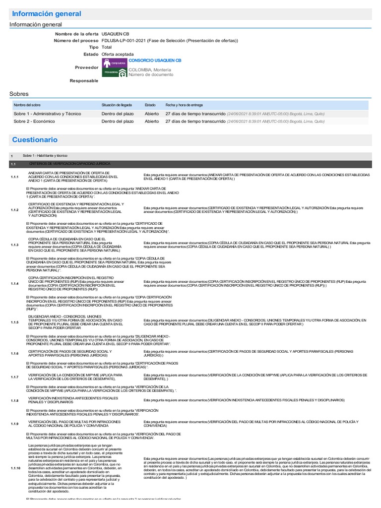 Sobre 1 - Administrativo y Técnico Dentro del plazo Abierto 27 días de tiempo transcurrido (24/06/2021 8:39:01 AM(UTC-05:00) Bogotá, Lima, Quito)