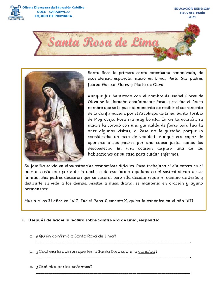 1. Después de hacer la lectura sobre Santa Rosa de Lima, responde: