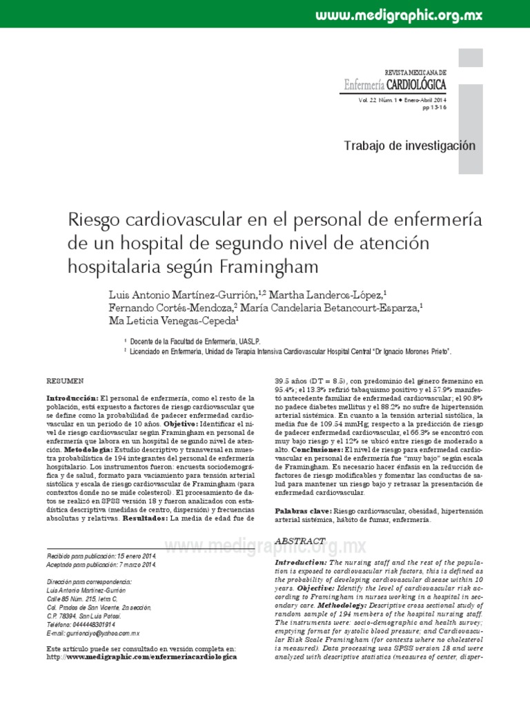 Calle 85 Núm. 215, letra C, cording to Framingham in nurses working in a hospital in sec-