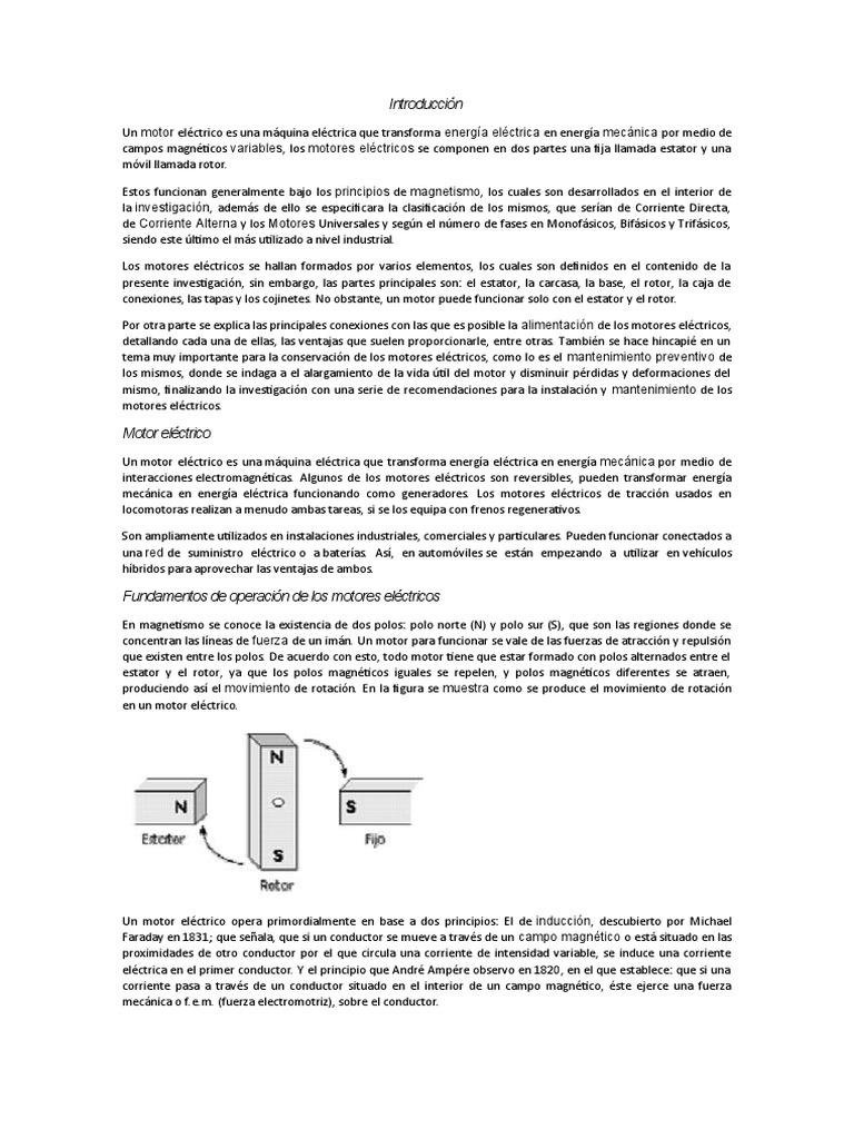 Un motor eléctrico opera primordialmente en base a dos principios: El de inducción, descubierto por Michael