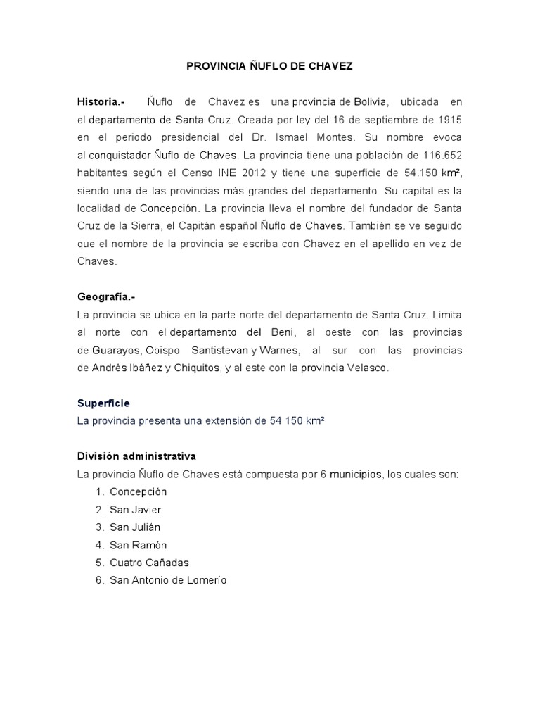 Historia.- Ñuflo de Chavez es una provincia de Bolivia, ubicada en