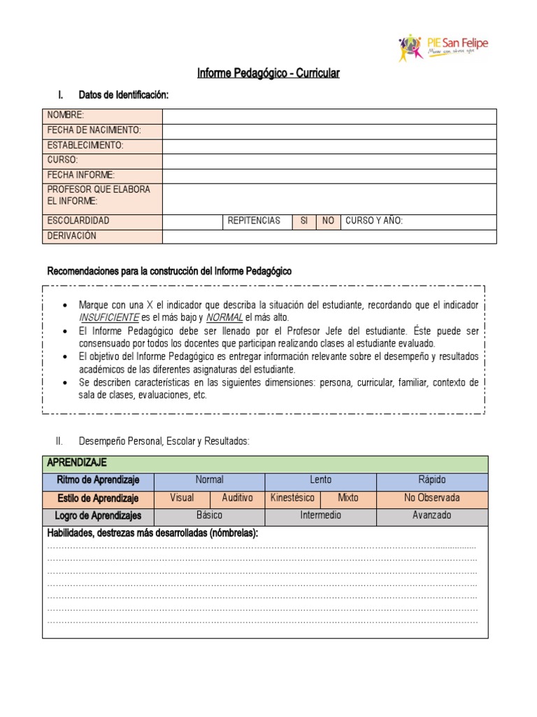 El Informe Pedagógico debe ser llenado por el Profesor Jefe del estudiante. Éste puede ser