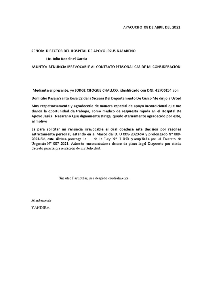 ASUNTO: RENUNCIA IRREVOCABLE AL CONTRATO PERSONAL CAS DE MI CONSIDERACION