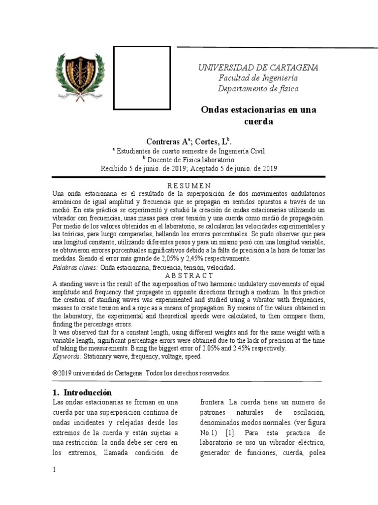 Palabras claves: Onda estacionaria, frecuencia, tensión, velocidad.